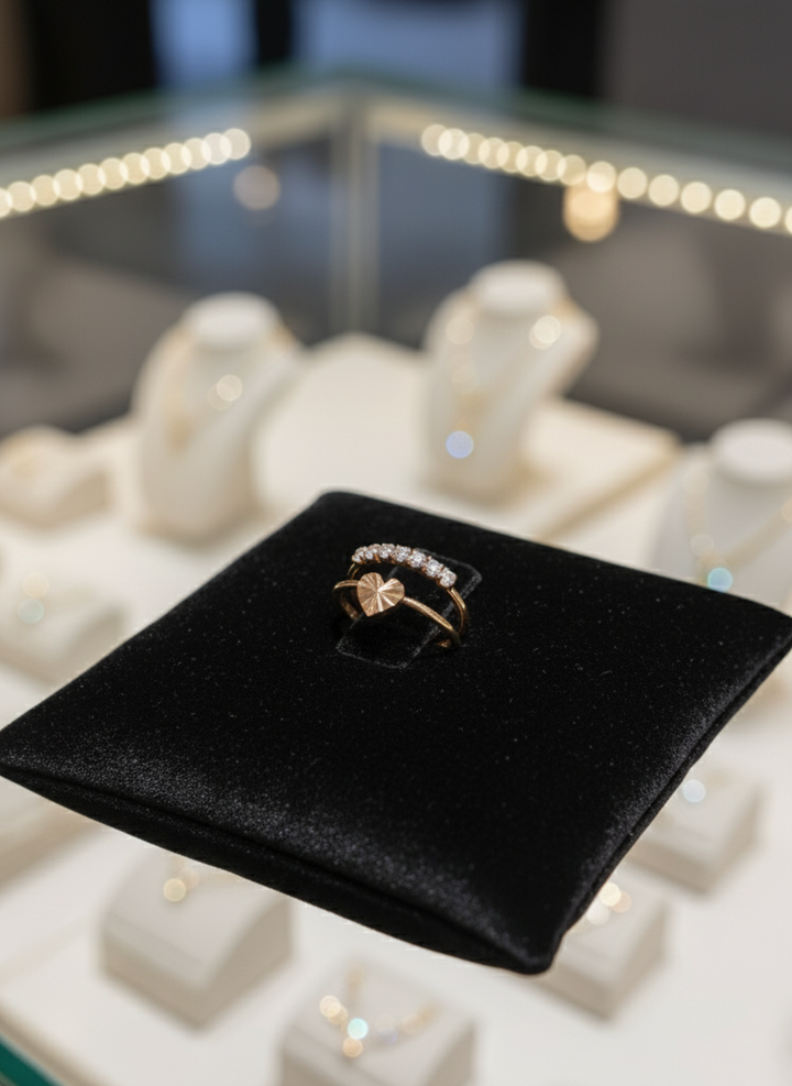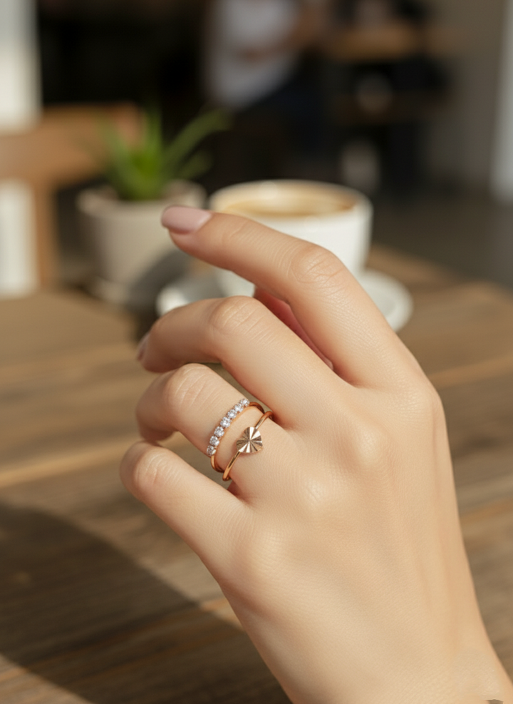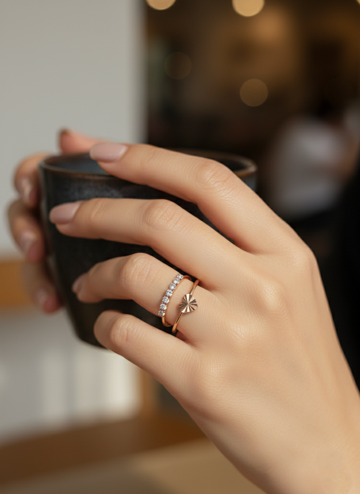 A graceful duo featuring a shimmering diamond-accent band paired with a modern sunburst charm ring. Perfect for adding a touch of elegance and everyday sparkle ☀️💎💫